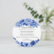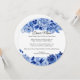 CARDÁPIO DE JANTAR com fundo azul céu claro com versão floral real, azul-marinho e azul claro em formato redondo. Um pássaro pousa em um galho entre as flores do jardim. Design criado pela artista, Audrey Jeanne Roberts. Direitos autorais. O design de Chinoiserie Floral Azul com Influência Asiática pintado à mão tem uma coleção completa disponível aqui (copie e cole o link no navegador): https://bit.ly/2DS0gN6