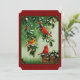 Um par de cardeais vermelhos nortes machos e fêmeas perca numa árvore sagrada, enquanto um terceiro cardeal se senta numa cesta de madeira tecida cheia de folhas e bagas ocas recentemente colhidas. Tudo num fundo vermelho festivo de férias. Imagem criada de uma pintura original de óleo por Crista Forest.
