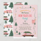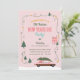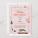 Reviva a Alegria do Natal Passado! Volte no tempo com esta divertida tradição familiar de convite personalizado de festa de Ano Novo de Natal com carro rosa vintage na árvore de Natal. Luzes de Natal penduradas na árvore de Natal e envolvendo o cartão de Natal com árvores de Natal, casa rosa e árvores. Mergulhe no encanto mágico de tempos antigos e crie memórias inesquecíveis com seus entes queridos! Desenho e arte por Moodthology Papery.