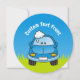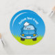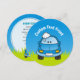 Caricatura azul sorridente com bolhas de sabão sobre grama verde sob o céu azul.