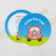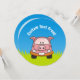 Cartoon de porco sorridente sobre grama verde sob céu azul.
