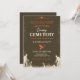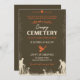 O convite apresenta um design minimalista com fundo castanho-escuro da Lava e sotaques branco-pérola e laranja-carrot. O layout é simples e limpo, com o texto centrado e os gráficos dispostos simetricamente. O efeito geral é assustador e inquietante, com o forte contraste entre o fundo escuro e os elementos mais leves criando um sentido de profundidade e mistério. O uso de crânio, morcegos, corvo e zumbis aumenta a atmosfera assustadora.