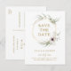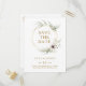 Este cartão postal de eucalipto dourado geométrico para salvar a data é perfeito para o seu casamento elegante e boêmio. É projetado com flores de anemona brancas e roxas boêmias simples, folhas de sage verde água-marinha simplistas e molduras de inverno em folha dourada modernas. Com a combinação de flores brancas e folhagens rústicas simples, você certamente criará a atmosfera dos seus sonhos.