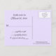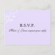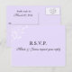 A coleção de casamento Lightly lavendar Breathless apresenta um fundo lavendar leve com um gráfico floral branco no canto superior. Use o recurso "personalizar" para alterar o estilo e/ou a cor da fonte. Use o recurso "personalizar" para alterar o estilo e/ou a cor da fonte. Uma maravilhosa maneira de te ajudar a planejar o número de convidados no seu casamento ou evento. *** ESSES CARTÕES POSTAIS RSVP SÃO UM TAMANHO PADRÃO DO CARTÃO POSTAL DE 4,25" x 5,6" (retrato) ou 5,6" x 4,25" (paisagem). SE A SUA INTENÇÃO FOR INCLUIR O RSVP COM O CONVITE, ELES APENAS SERÃO AJUSTADOS NOS ENVELOPES FORNECIDOS COM OS CONVITES 5X7. OS CARTÕES POSTAIS RSVP NÃO SERÃO AJUSTADOS EM NENHUMA OUTRA ENVELOPE CONVITE OFERECIDA NO ZAZZLE, DIFERENTE DO TAMANHO 5X7.***