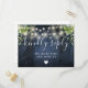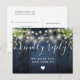 Uma corda ilumina madeira azul rusticada com cartão RSVP boho verde com tipografia quic. O inverso apresenta os seus detalhes e uma solicitação divertida de música de convidado. Projetado por Thisnotme©
