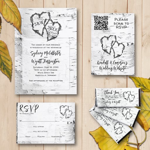 Convite Carved Hearts White Birch Bark Wedding