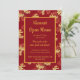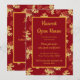 Convite para Casa Aberta da Colheita, com sotaques de folhagem de outono vermelha e dourada. Com um fundo vermelho escuro e letras douradas, você pode personalizar com suas próprias informações. Com um cardápio de amostra no verso, você pode informar aos seus convidados o menu que está servindo.