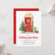 Convites de férias elegantes para casas abertas, com a ilustração aquosa de uma porta vermelha aberta decorada com uma coroa festiva. Uma árvore de Natal com um presente embrulhado enfeita a fenda da frente com uma planta de vinificação e um monte de toros. Personalize os convites à casa aberta de feriados com os detalhes do evento abaixo. O convite se inverte para exibir um fundo vermelho nevado.