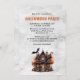 Convite para festas de Halloween com ilustrações aquáticas de uma casa assombrada, morcegos, abóboras e um jack o’lantern vestindo um chapéu de bruxa.
