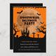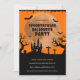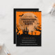 Em um fundo laranja, há árvores negras, casas assombradas, cemitérios e morcegos voando ao redor de uma grande lua de cheio.
