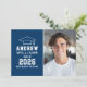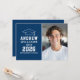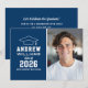 Anuncie sua celebração com este convite de casa de abertura de formatura em azul marinho moderno, apresentando um ícone de gorro clássico e tipografia ousada em estilo varsity. Adicione o nome do formando, escola e ano de conclusão na frente com uma foto favorita. O verso apresenta “Vamos Celebrar o Formando” com espaço para os detalhes da festa e RSVP. Limpo, atemporal e perfeito para uma casa de abertura de formatura de um veterano.
