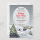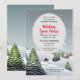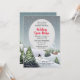 Este convite clássico em estilo de terra de maravilha do inverno apresenta neve caindo sobre uma encosta com árvores sempre verdes e uma casa no vale. Um design de inverno perfeito para uma festa de Natal ou de Férias.