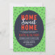Celebrando sua nova casa com uma Festa de Aquecimento Doméstico. Convide amigos e família com este Convite de festas de Aquecimento Doméstico com as palavras "Home Sweet Home" e um vibrante padrão de fundo verde e azul moderno. Personalize este convite substituindo o texto do marcador de posição no modelo. Para obter mais opções, como alterar a fonte e seu tamanho, clique no botão "Personalizar". Este convite também inclui um lado traseiro com padrão. *Observe que a Marca d'água do Zazzle que aparece na visualização de zoom não aparecerá no produto impresso final. © Rosewood e Citrus