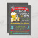 É uma Fiesta com estes super legal Tacos, Tequila e Casais de Cerveja convites de festas. Excelente para uma festa de noivado. Apresenta um copo de tequila, taco e uma caneca de cerveja gelada com faixa e tipografia divertida contra fundo de quadro. Ilustração desenhada à mão pelo McBooboo.
