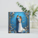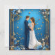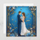 Uma representação romântica de um casal de casamento que se posiciona tenazmente, cercado por intrincadas decorações florais azuis e douradas, capturando uma atmosfera de elegância e celebração.