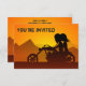 Um Casal de Silhueta de Cartoon Bonito Dirigindo um Convite para Casamento de Motocicletas. Possui montanhas e fundo solar. *