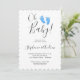 Send these simple and stylish baby shower invitations to family and friends. They are decorated with modern typography and cute hand-painted watercolor baby's feet in pastel blue with a scalloped edge. Easily customizable Original Watercolor © Michele Davies.