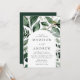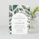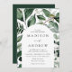 Convites elegantes de casamento com os detalhes do seu casamento... aninhavam dentro de um quadro arquitetado cercado por eucalipto, samambaias e outros ricos verdes. Os convites de casamento do arco botânico revertem para um fundo verde-escuro sólido. Projetado para coordenar com nossa coleção de casamento Abundant Greenery.