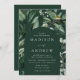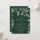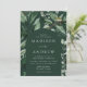 Convites elegantes de casamento com seus detalhes de casamento aninhavam dentro de um quadro arquejado cercado por eucalipto, samambaias e outros ricos verdes com um fundo verde escuro. Os convites de casamento do arco botânico revertem para um fundo verde-escuro sólido. Projetado para coordenar com nossa coleção de casamento Abundant Greenery.