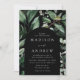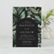 Convites elegantes de casamento com os detalhes do seu casamento... aninhavam dentro de um quadro arquitetado cercado por eucalipto, samambaias e outros ricos verdes com fundo preto. Os convites de casamento do arco botânico revertem para um fundo verde-escuro sólido. Projetado para coordenar com nossa coleção de casamento Abundant Greenery.