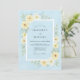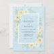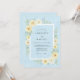 Este design apresenta um fundo suave azul centáurea adornado com um delicado arranjo de aquarela de rosas amarelas manteiga e dálias brancas cremosas. Folhagens verde-sage exuberantes e ramalhetes botânicos etéreos criam uma atmosfera serena perfeita para um evento romântico de primavera ou verão. A paleta combina tons pastéis frios com sotaques florais quentes para evocar um senso de elegância atemporal e beleza natural.