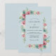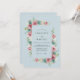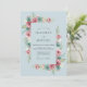 Este design apresenta um sereno fundo azul pó adornado com um arranjo vibrante de flores em aquarela. Rosas cor-de-rosa delicadas e peônias estão entrelaçadas com flores azul-esverdeadas suaves e folhagens verdes exuberantes. Os elementos botânicos artísticos criam uma atmosfera romântica e arejada perfeita para um evento nupcial sazonal.