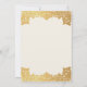 Este convite de casamento elegante com um ar vintage, recomendado para um casamento de gala, tem decorações barrocas elegantes douradas nas bordas superior e inferior e um fundo marfim (quase branco). Todo o texto pode ser personalizado e tem uma cor dourada semelhante às decorações douradas. A ocasião "Casamento" e os nomes são escritos em uma fonte caligráfica elegante, o restante em maiúsculas.