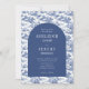 Este convite apresenta um padrão azul e branco na imitação do antigo Tóile de jouy francês, que mostra vinhetas paisagísticas de prédios e árvores. O texto aparece em branco em forma de arco azul marinho. A parte de trás repete o padrão do tronco azul e branco.