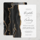 A borda esquerda deste elegante convite de casamento moderno apresenta uma coloração aquosa preta, borda agitada, aparada com falso brilho dourado. O texto personalizável combina manuscrito, copperplate e fontes itálicas em cinzas de carvão em um fundo branco. O verso apresenta um design de agate preto e dourado correspondente.