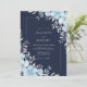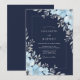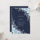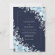 Este design apresenta um fundo azul marinho profundo acentuado por delicadas flores azuis de gelo e folhagens cinza prateado. A paleta de cores frias cria um clima sofisticado e sereno para um evento sazonal. Detalhes botânicos elegantes, como folhas prateadas e flores suaves, adicionam um toque polido ao design.