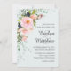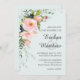 Este belo convite de casamento mostra rosas rosa-pinceladas acentuadas com folhas de oliveira e galhos aqua. O texto da cinza complementa as cores suaves do buquê. Os nomes da noiva e do noivo são carinhosamente representados juntamente com os detalhes da data do casamento, hora e local. Todos os detalhes, incluindo a cor do texto, são completamente personalizáveis.
