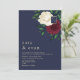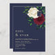 Elegante e eterno, este convite para o casamento floral burgundy e marinho azul apresenta um design sofisticado com rosas vermelhos e brancos exuberantes, aliados a folhas verdes profundas. O rico fundo azul marinho cria um contraste luxuoso, enquanto os sotaques dourados adicionam um toque de elegância. Perfeito para casamentos formais, este convite é fácil de personalizar com seus detalhes de casamento, fazer uma bela escolha para seu dia especial.