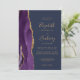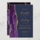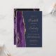 A borda esquerda deste elegante convite de casamento moderno apresenta uma cor d'água roxa, borda agitada, aparada com falso brilho dourado. O texto personalizável combina manuscrito dourado, fontes em copperplate e itálico em um fundo azul marinho. O verso apresenta um design de agate roxo e dourado correspondente.