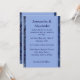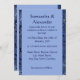 Este convite de casamento apresenta um fundo azul claro, marcado por um padrão de retalhos em tons de azul. Bonito e contemporâneo.