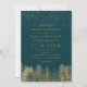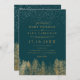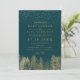 Casamento de pinheiros de inverno com pinheiros dourados mostrando uma terra maravilhosa de madeira e neve branca caindo, com tipografia elegante e moderna em azul editável.