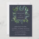Folhagem russa, convite de casamento. Verde impermeável de cor d'água em tons de verde e azul. A placa apresenta cor de fundo azul de marinho sólido.