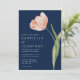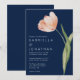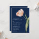Um elegante convite de na moda de casamento em cores de azul marinho e pêssego. O simples design apresenta um cartão azul marinho com um sistema de tulipas de cor d'água com pincel de cor d'água de solteiro e uma tipografia branca moderna para personalizar seus detalhes importantes.