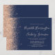 A borda esquerda deste elegante convite de casamento moderno apresenta uma borda falsa de pêssego. O texto personalizável combina manuscrito de pêssego, fontes em copperplate e itálico em um fundo azul marinho. O verso apresenta um design azul-marinho e brilhante de pêssego correspondentes.