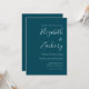 Este simples convite de casamento moderno apresenta um texto branco sobre um fundo azul teal. Adicione os nomes da noiva e do noivo na caligrafia de escrita manual do na moda e os detalhes na fonte sans serif. O lado inverso é uma sombra correspondente de palha sólida.