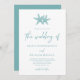 Este moderno convite mínimo para o casamento na praia tem um fundo branco com texto azul de vidro marinho, dois estrelas-do-mar no topo, e caligrafia tradicional com script. As costas estão verdes.