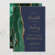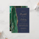 A borda esquerda deste elegante convite de casamento moderno apresenta uma esmeralda verde aquarela agate borda com falsa brilho dourado. O texto personalizável combina manuscrito dourado, fontes em copperplate e itálico em um fundo de marinho. O verso apresenta um design emerald verde e dourado.