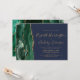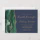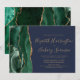 A borda esquerda deste elegante convite de casamento moderno apresenta uma esmeralda verde aquarela agate borda com falsa brilho dourado. O texto personalizável combina manuscrito dourado, fontes em copperplate e itálico em um fundo azul marinho. O verso apresenta um design emerald verde e dourado.
