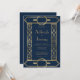 Este elegante convite de casamento inspirado na vintage apresenta texto dourado num fundo azul marinho, enquadrado por uma na moda vintage geométrico deco border em folha de ouro falsa. O verso é azul marinho sólido.