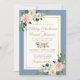 Cartão de Convite para Casamento Azul, branco-branco, cor-de-rosa, cor-de-água, inclui rosas cor-de-rosa, flores brancas e vegetação botânica numa estrutura dourada. Texto Dourado.