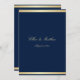 Um Convite para Casamento de Trim Azul e Dourado, Marinho Elegante, desenhado com texto e trim dourados, sobre fundo azul Marinho. O texto do convite inclui: Nomes de cheio de noiva e de grupo, Data de casamento, Hora, Local e Detalhes de recepção. O lado oposto inclui os primeiros nomes e a data de casamento da noiva e do noivo num fundo azul Marinho. Para personalizar, basta inserir seus detalhes em nosso modelo fácil, substituindo o texto de exemplo. Certifique-se de ver a coleção de casamento azul e Dourada do Elegante Marinho completa para cartões e acessórios correspondentes.
