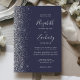 A margem esquerda deste elegante convite de casamento moderno apresenta um design de cintilação de prata. O texto personalizável combina a escrita manual de cinzas prateadas, fontes copperplate e itálico em um fundo azul escuro de marinho. O verso apresenta um design brilhante azul escuro e prateado.