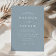 Convites de casamento minimalistas e modernos, com detalhes de casamento em letras brancas, com acentos de escrita caligráfica sobre um fundo azul empoeirado. O fundo azul empoeirado pode ser alterado para uma cor de sua escolha. Projetado para coordenar com a nossa coleção de casamento do Modern Elegance.