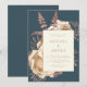 Este elegante convite para o casamento apresenta um buquê floral romântico, luxuoso, no marfim, com folha de ouro rosa e folhagem brilhante num fundo azul escuro. Personalize o texto cor-de-rosa rosa em fontes na moda num retângulo de marfim. A parte traseira da placa é sólida.