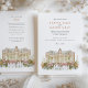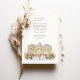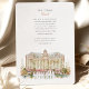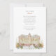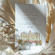 Convide seus convidados para uma celebração espetacular com este elegante convite de casamento em aquarela, com o icônico Hotel Bellagio & Casino em Las Vegas. O trabalho de arte capta lindamente a grandeza do resort, com sua fachada distintiva creme, bege e ocre-claro, sotaques castanho-avermelhado/terracota de nível inferior, e dicas de verde-azul na janela e nos detalhes do telhado. As famosas Fontes de Bellagio são representadas em cheio com plumas brancas de água, todas refletidas no lago sereno primeiro. A cena é graciosamente moldada por árvores verdes e arbustos, bem como grampos de folhas estilizados em tons de verde e ouro-amarelo/castanho claro, sugerindo um toque de outono. Criado em um estilo aquoso suave e luxuoso, este convite é perfeito para um glamouroso casamento de Las Vegas, um evento de destino sofisticado, ou para casais que adoram luxo icônico. A frente apresenta elegantemente seus detalhes de casamento, enquanto o lado inverso oferece "Os Detalhes Mais Finos" para informações de convidado.