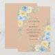 Este design apresenta um fundo quente de cor de areia adornado com flores suaves em aquarela. Rosas delicadas em azul pálido e amarelo claro estão aninhadas entre folhas de eucalipto prateadas para uma estética serena e natural. A paleta de azul desbotado, amarelo creme e bege terroso cria uma atmosfera romântica. Aglomerações botânicas exuberantes acentuam o layout, oferecendo um visual gracioso e polido.